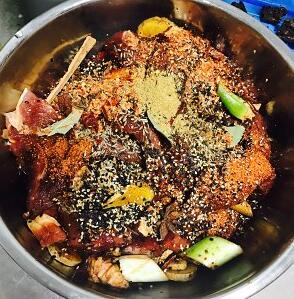 2、加上葱姜蒜(蒜要少放、姜可以多放些)八角花椒香叶桂皮孜然辣椒芝麻盐鸡精都放进去开始腌制,我口重一般放四小勺盐,孜然辣椒放了很多种、整粒的孜然辣椒,半碎的孜然辣椒,和孜然辣椒面儿